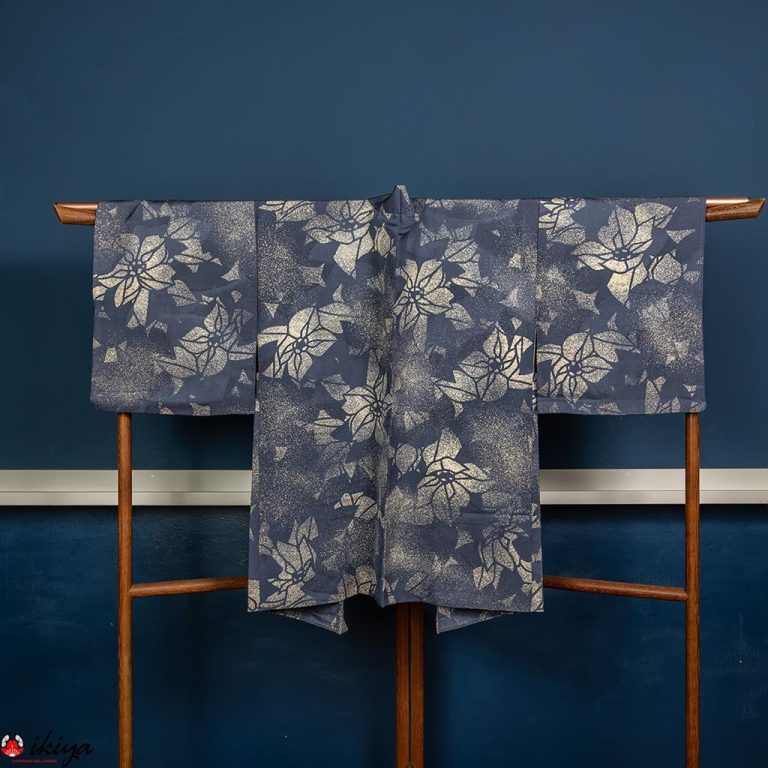 Haori da donna in seta “rinzu” blu con fiori bianchi