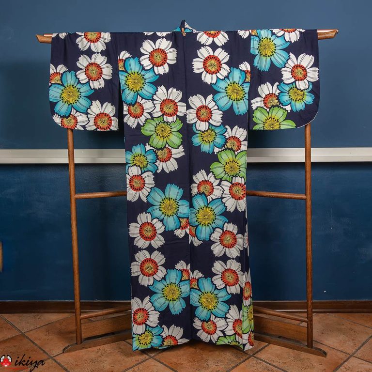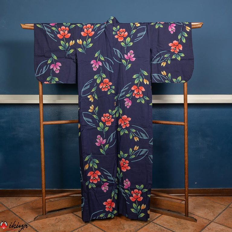 • Yukata, kimono estivo blu indaco con fiori colorati