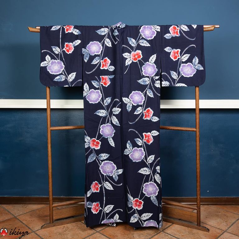 • Yukata, kimono estivo blu indaco con fiori rossi e viola