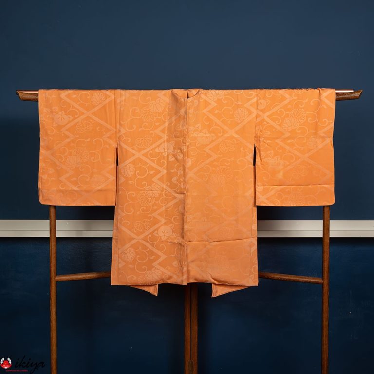 Haori da donna in seta marrone e arancio con fantasia floreale