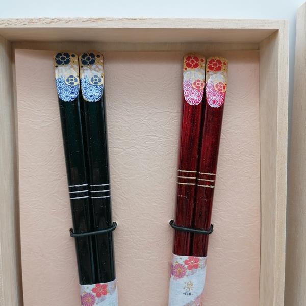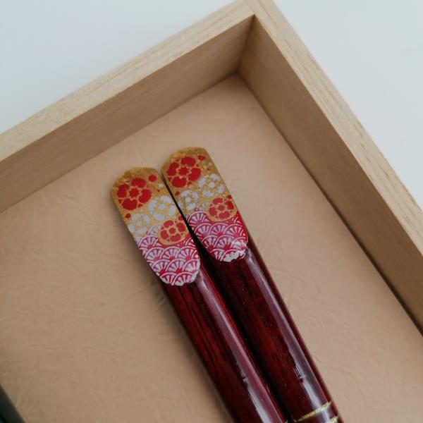 Splendido set composto da una raffinata coppia di hashi (bacchette) realizzate in legno naturale laccato e decorate con un raffinato motivo tradizionale sull’estremità superiore. Le due hashi hanno lunghezza differente: quella rossa, più corta è femminile, quella nera, più lunga, è maschile. Nella confezione sono inclusi anche due “hashi-oki”, poggia-bacchette in legno naturale.