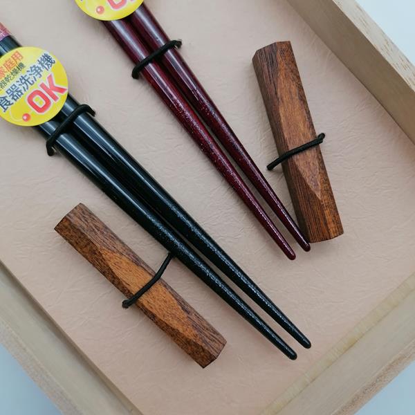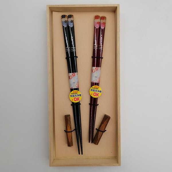 Coppia di bacchette con poggia-hashi e scatola in legno