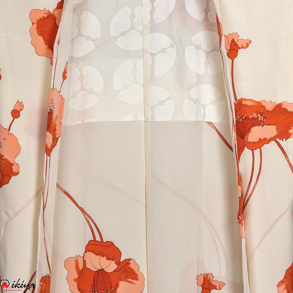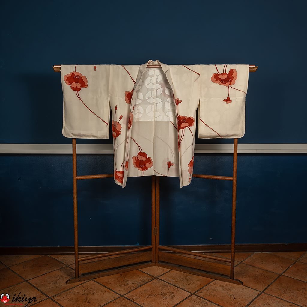 Splendida giacca haori in seta “chirimen” (un tipo di tessuto simile alla nostra crèpe di seta, spesso e leggermente ruvido) di colore avorio, decorata con uno straordinario motivo di papaveri sui toni del rosso/arancio.