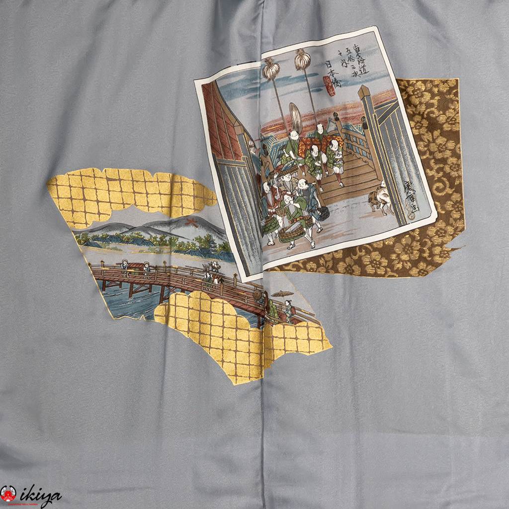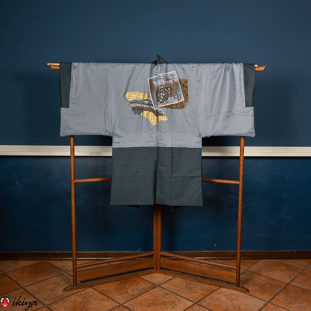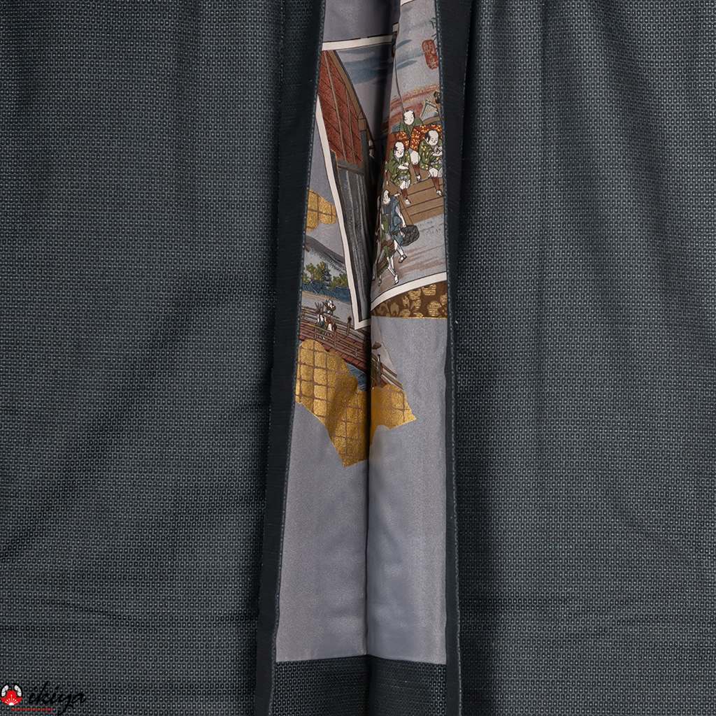 Meravigliosa giacca haori da uomo in seta di colore blu. La fodera interna è decorata con la riproduzione di una stampa del famoso pittore Ukiyo-e, Utagawa Hiroshige. Hiroshige è noto per aver rappresentato vari paesaggi del Giappone nella serie “Le cinquantatré stazioni del Tokaido”. Su questo haori è raffigurata la prima delle 53 stazioni: il ponte Nihonbashi al mattino. La processione del signore locale, il daimyo, attraversa il ponte ed inizia il suo lungo percorso verso la capitale Edo, preceduta da un gruppo di pescivendoli che trasportano il pesce acquistato al mercato verso il centro città.