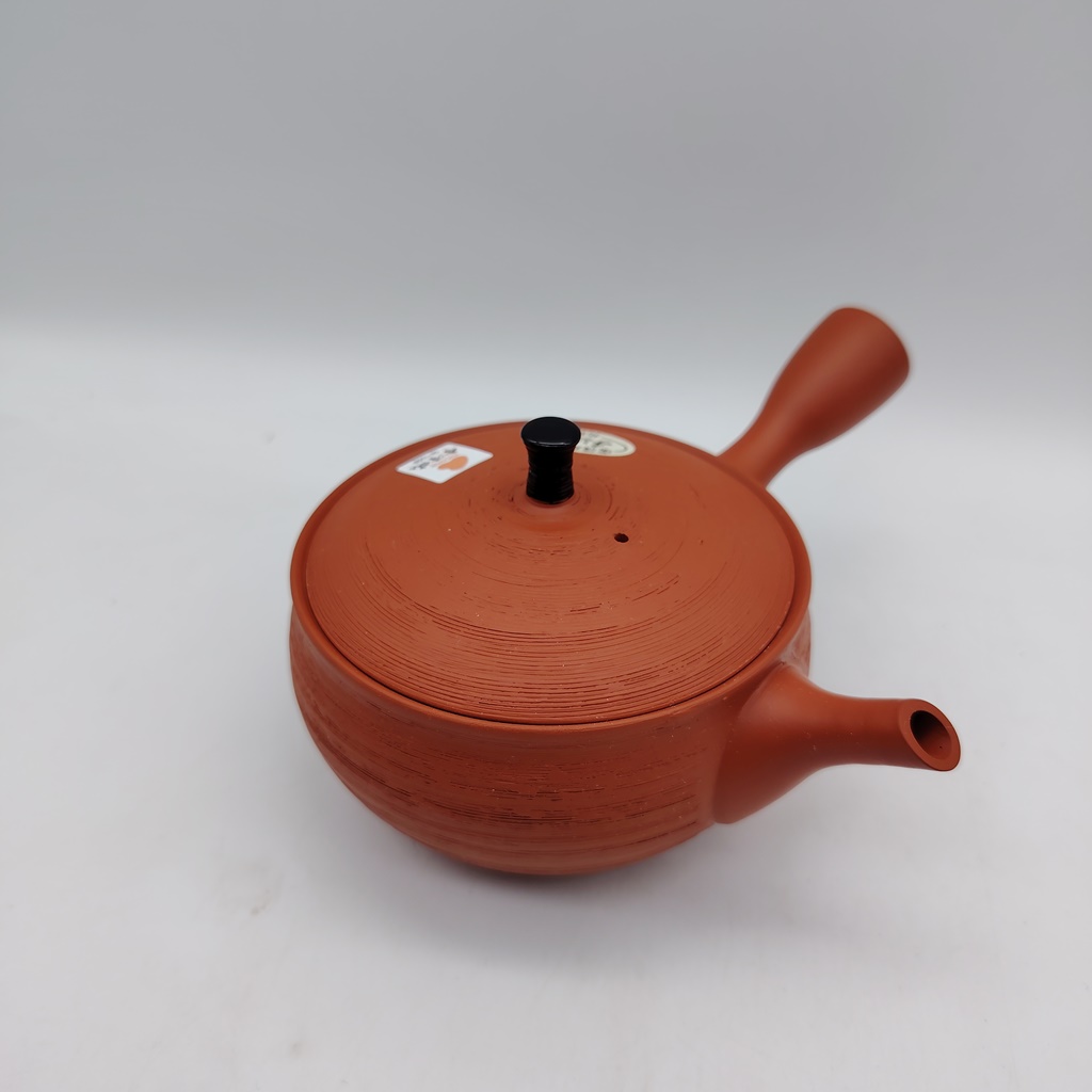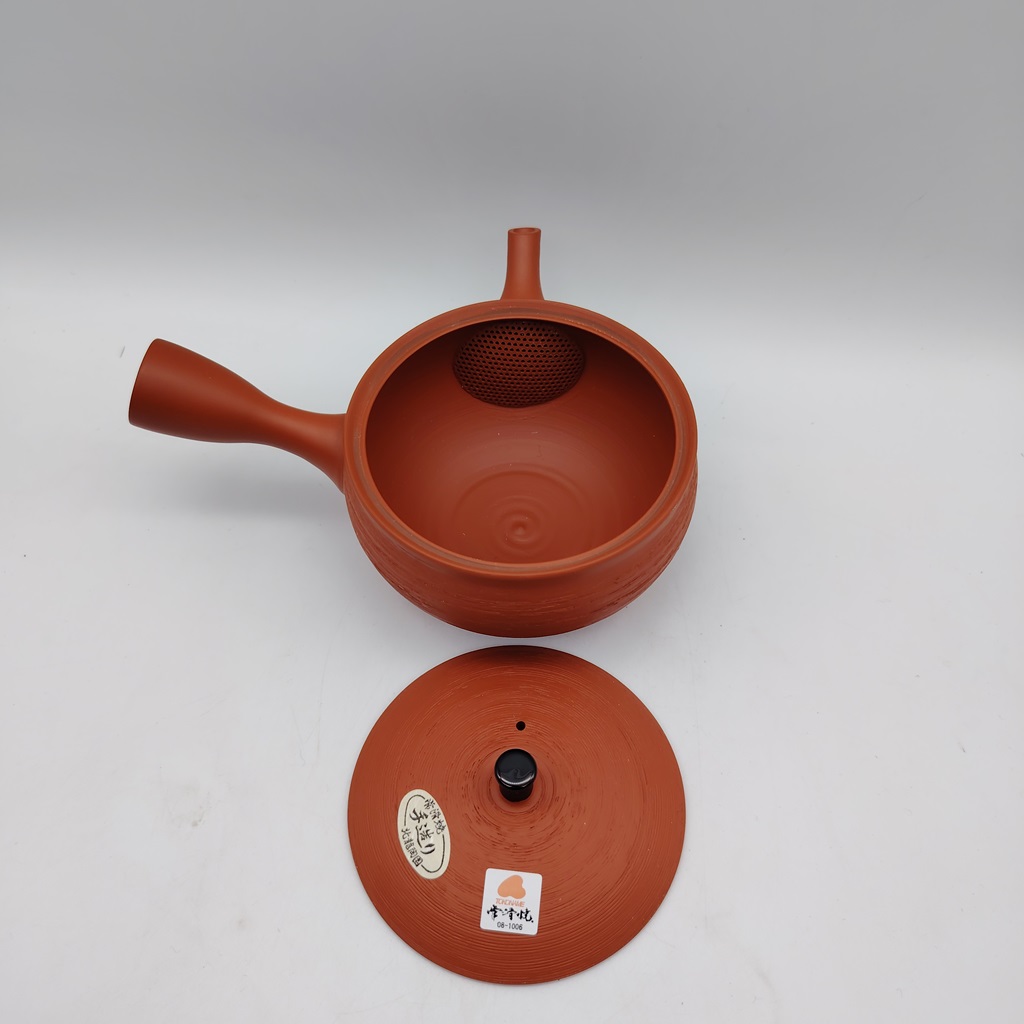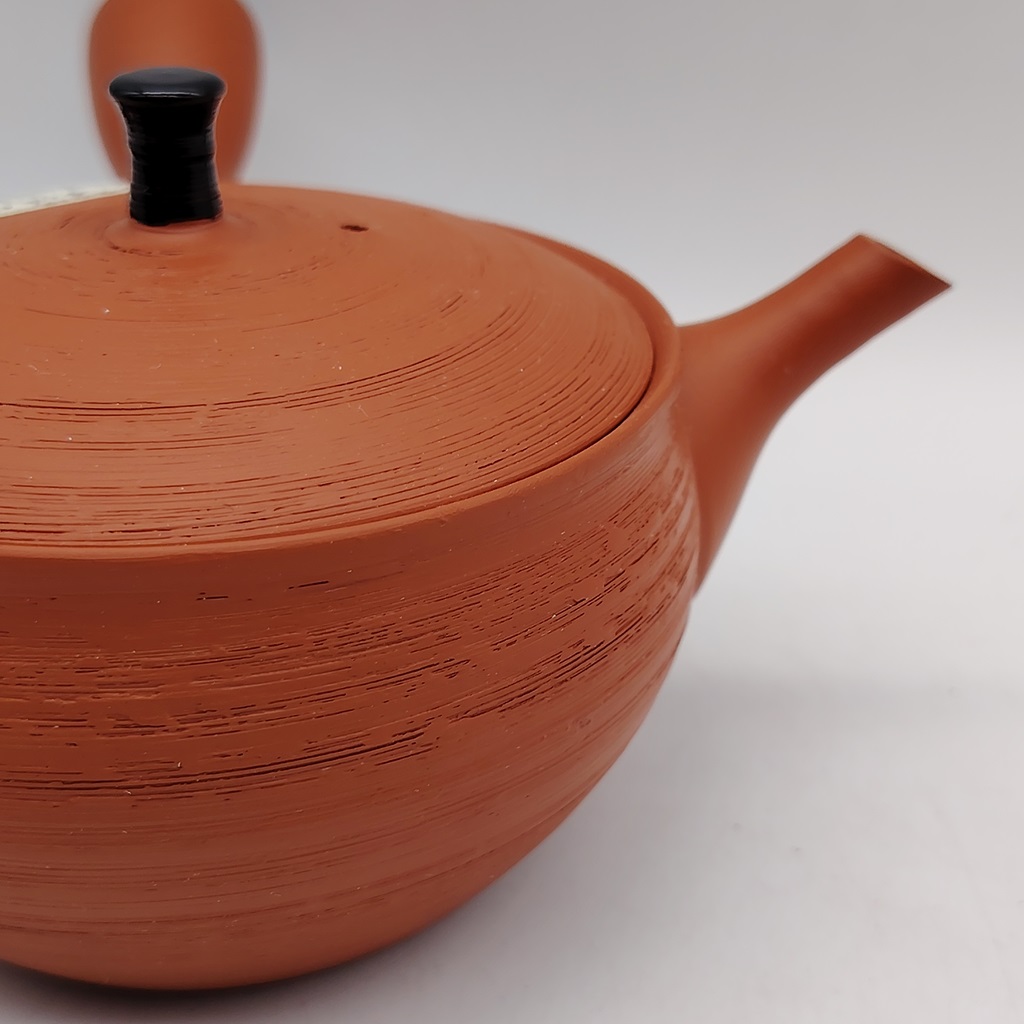 Questa kyusu è stata realizzata a mano in ceramica rossa “shudei” non smaltata ma decorata con l’effetto “matsukawa” 松皮 (texture a corteccia di pino) su tutta la superficie. A dare un tocco unico e prezioso è il piccolo pomolo, dipinto in lucida lacca nera.