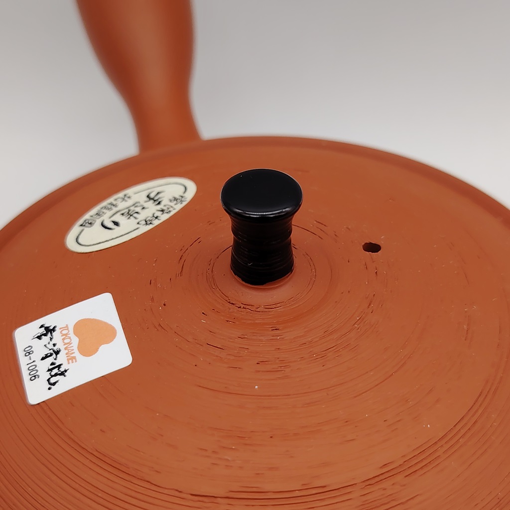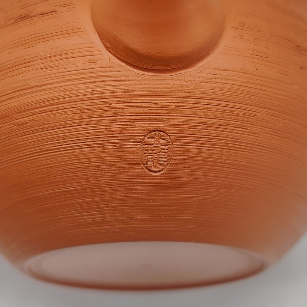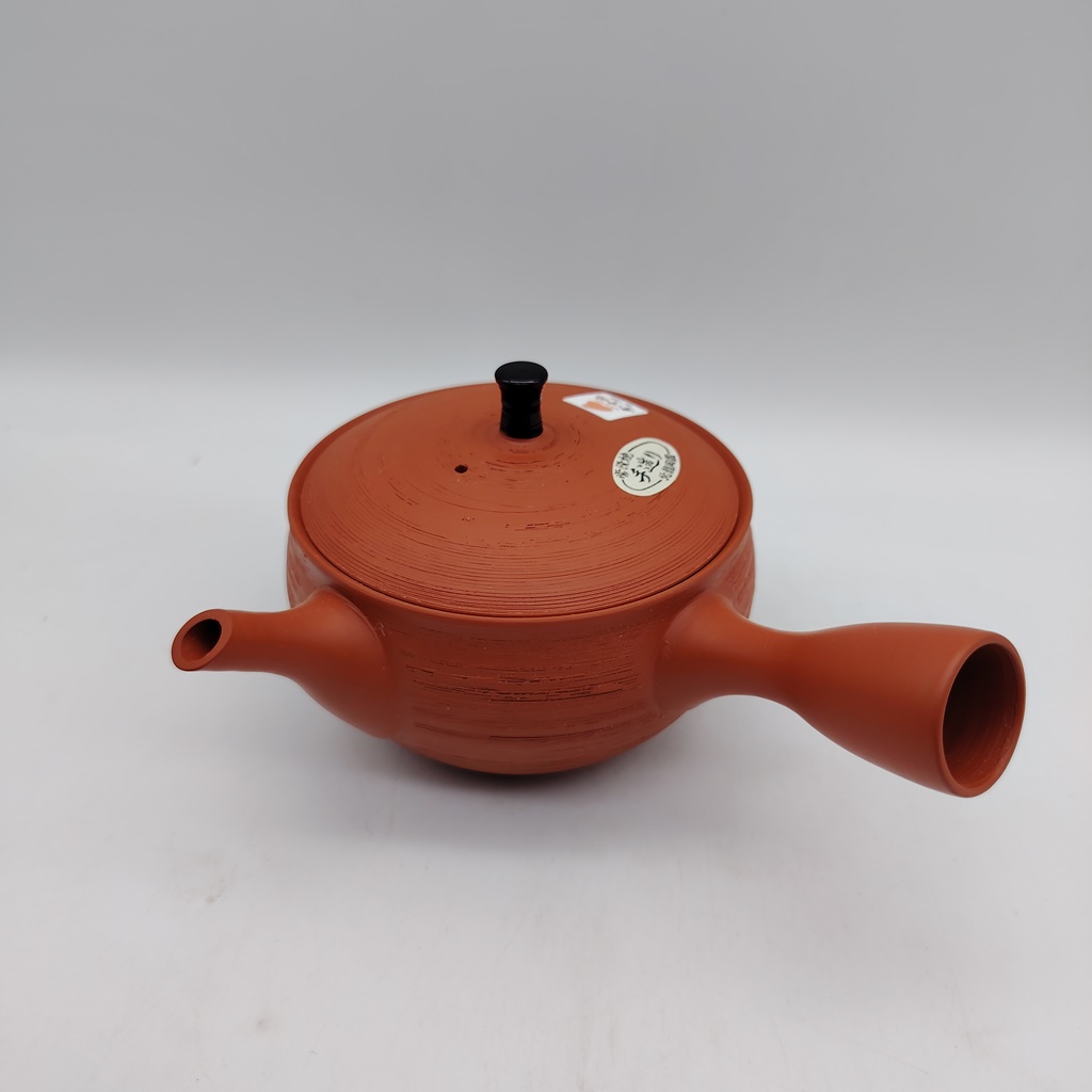 Questa kyusu è stata realizzata a mano in ceramica rossa “shudei” non smaltata ma decorata con l’effetto “matsukawa” 松皮 (texture a corteccia di pino) su tutta la superficie. A dare un tocco unico e prezioso è il piccolo pomolo, dipinto in lucida lacca nera.