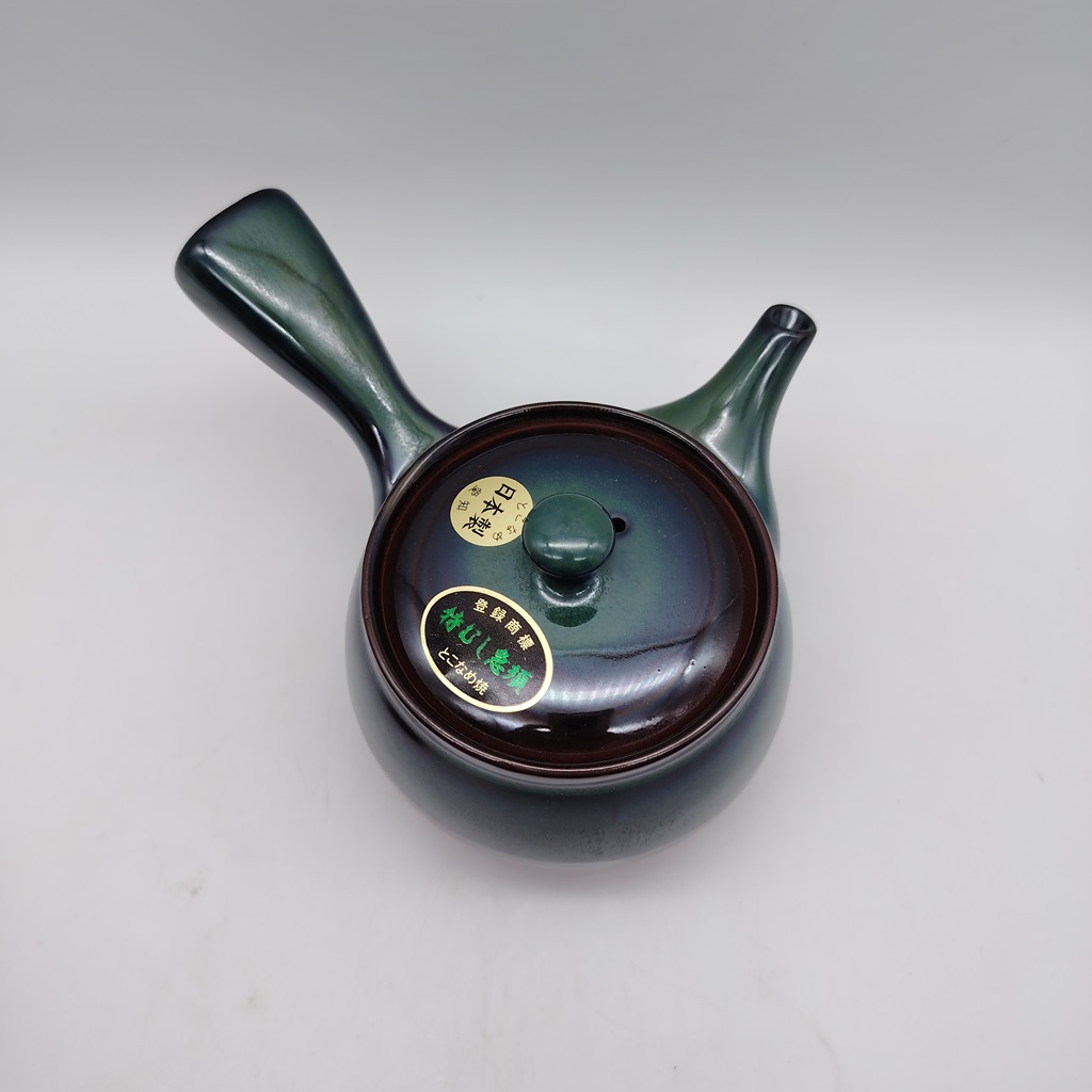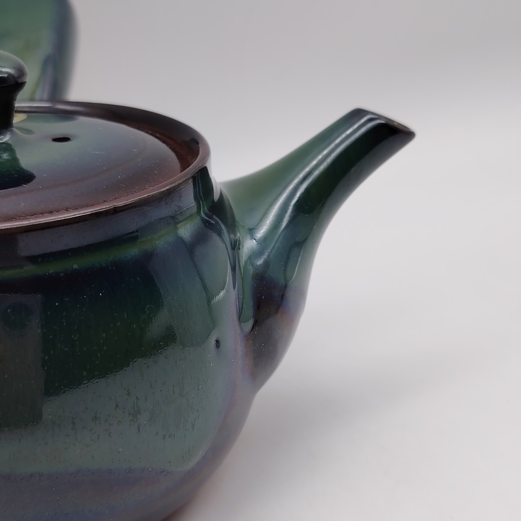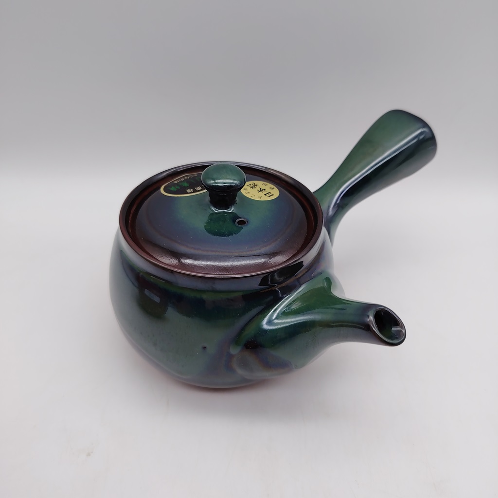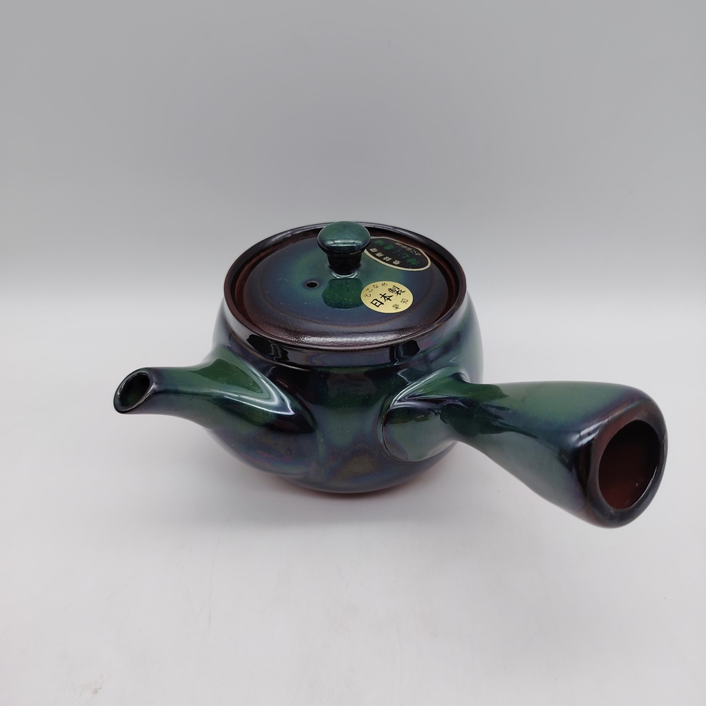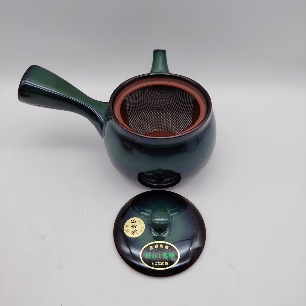 Questa kyusu è realizzata in ceramica naturale/rossa e smaltata con uno splendido colore verde-blu cangiante. Il suo design è stato creato appositamente per renderla facile da utilizzare e da pulire e durevole nel tempo.