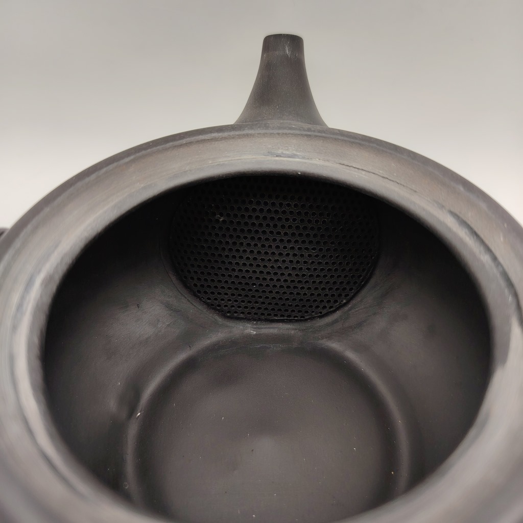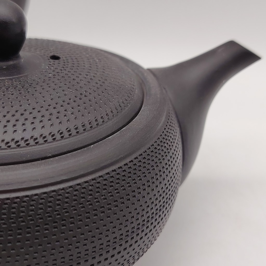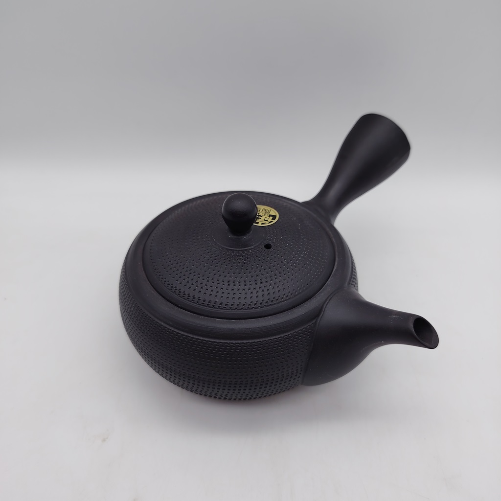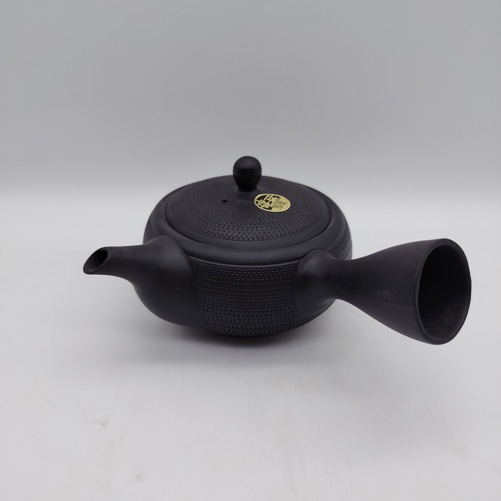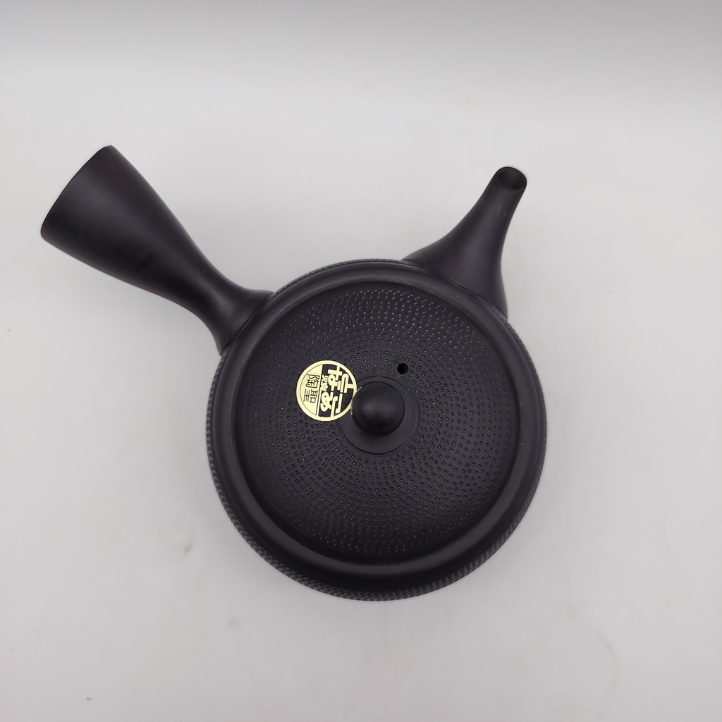 Questa kyusu è realizzata in ceramica di colore nero “kokudei” ed è impreziosita da una particolare decorazione fatta a cesello mentre il tornio ruota, chiamata “tobikanna”, la quale dona un senso di movimento ad una superficie liscia.