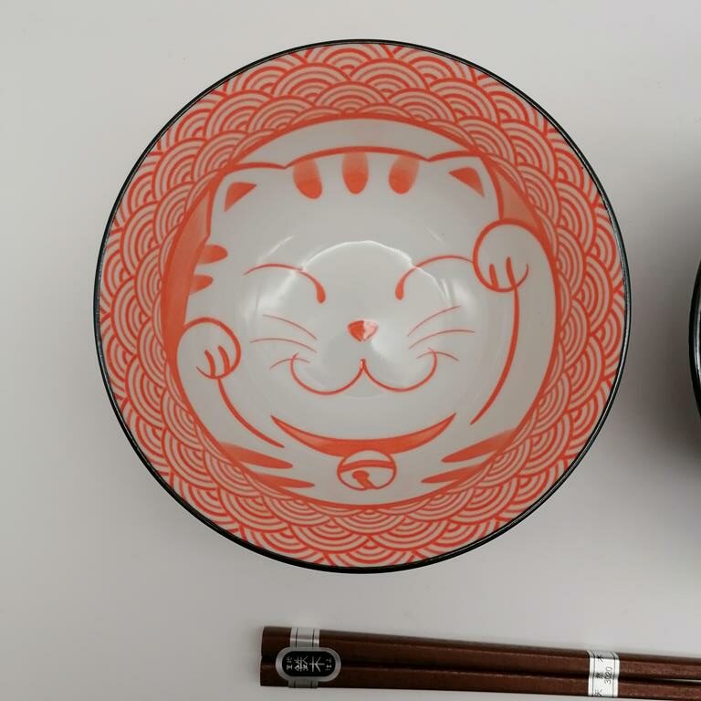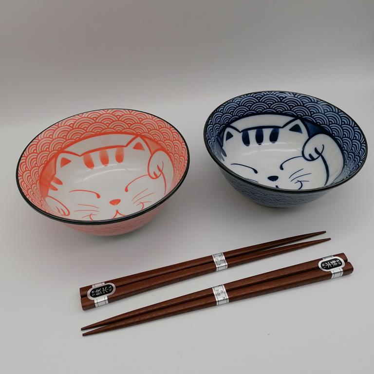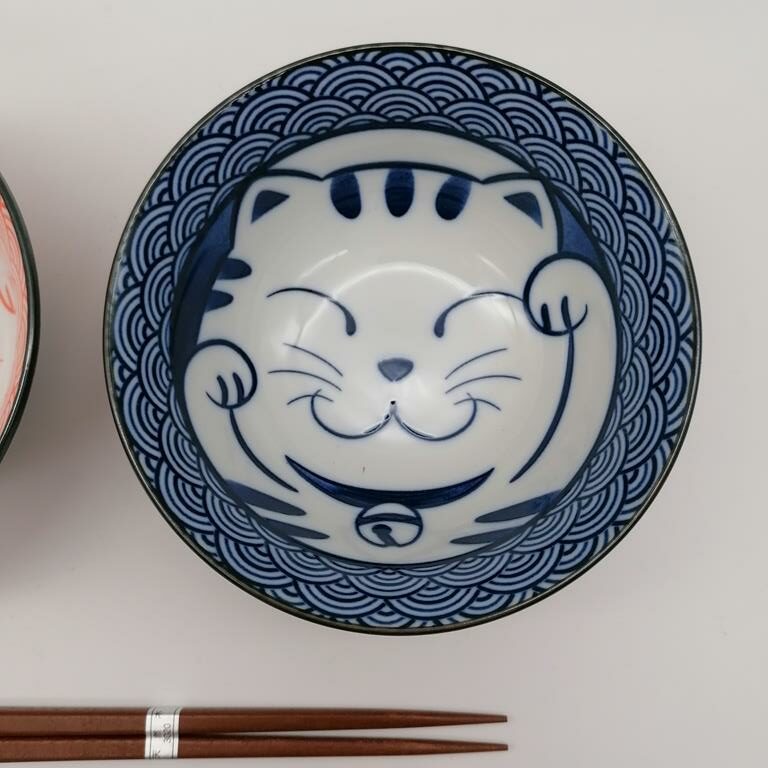 Le decorazioni delle ciotole, una rossa e una blu, sono particolarmente raffinate e rappresentano i maneki neko, i gatti giapponesi portafortuna.