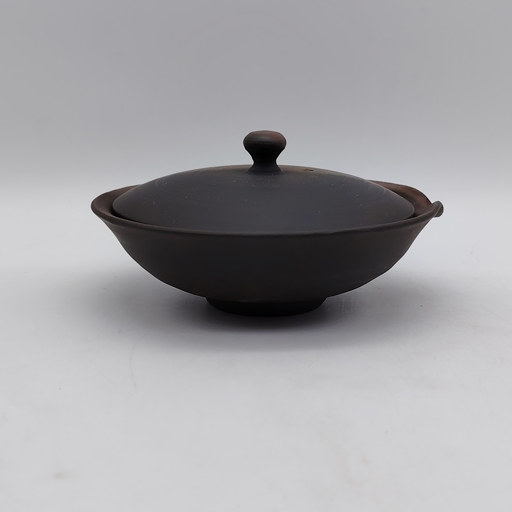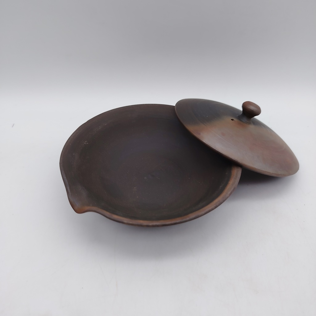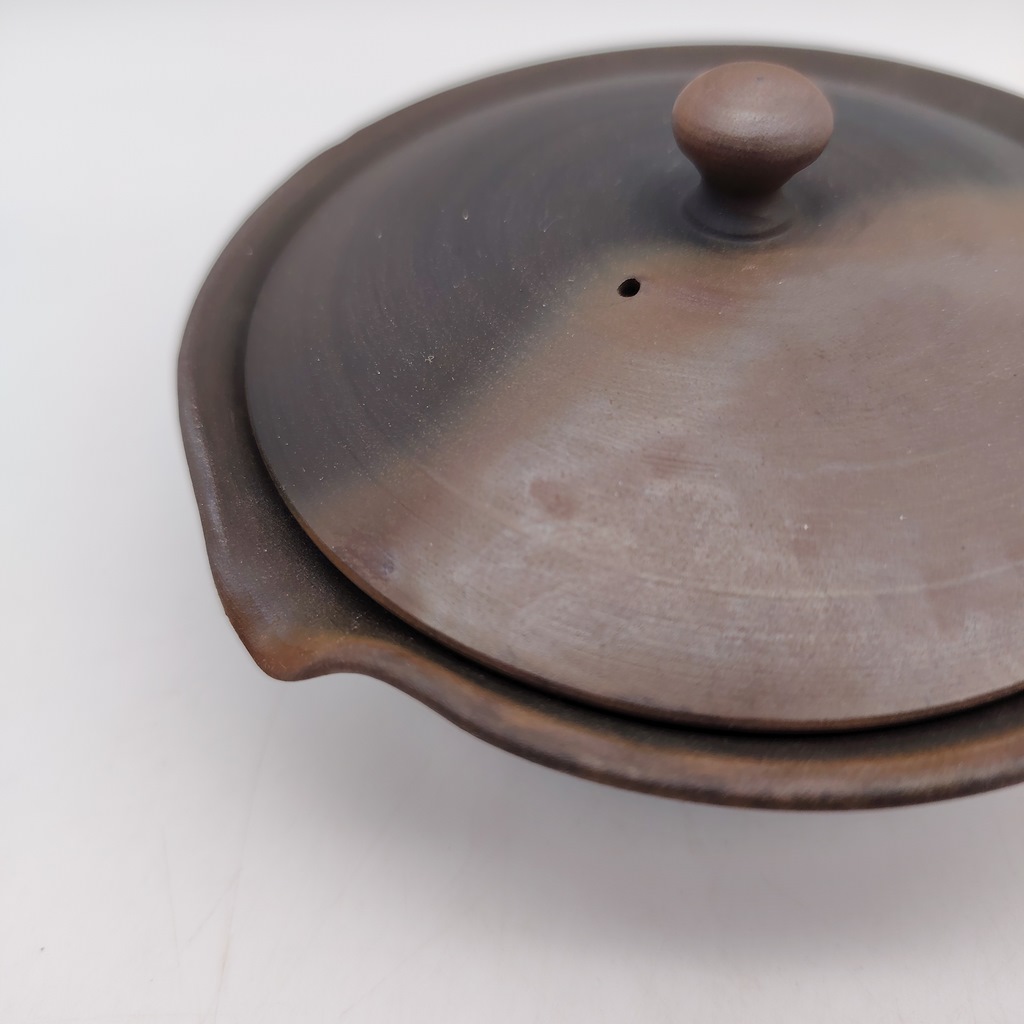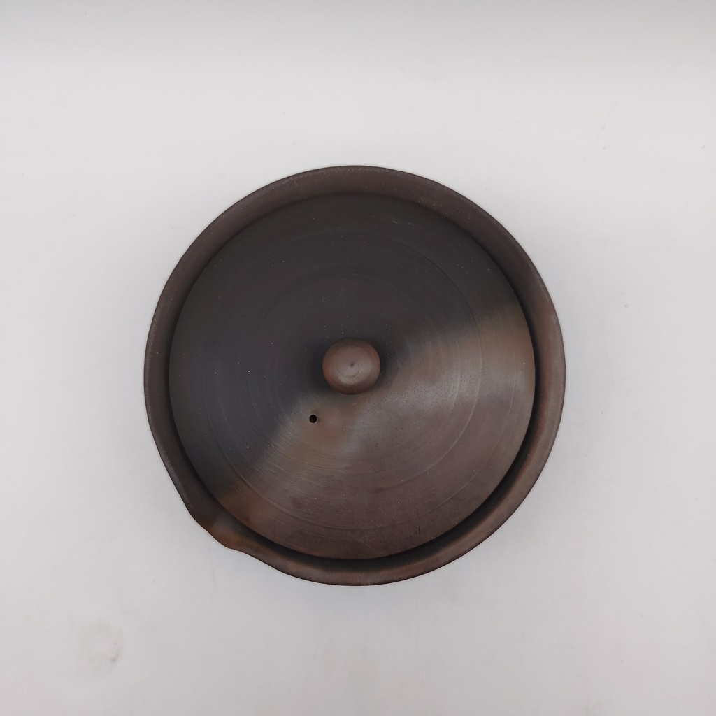 Questa shiboridashi è stata realizzata a mano in ceramica nera “kokudei” non smaltata, impreziosita dagli effetti “hi-yohen” e “sujibiki” (火窯変 e 筋挽き). Hi-yohen si riferisce alla “trasformazione cromatica” causata dal contatto diretto con la fiamma e la cenere del forno. Questo crea sfumature naturali e uniche sulla superficie della ceramica. Sujibiki invece indica una tecnica decorativa dove vengono incise delle linee circolari o scanalature sottili sulla superficie del pezzo mentre ruota sul tornio.